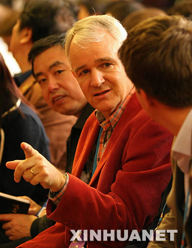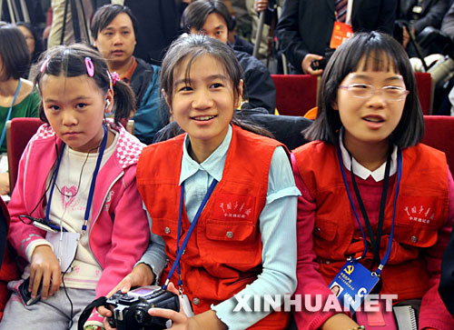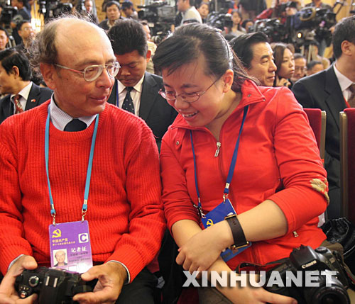 10月22日,十七屆中央政治局常委在北京人民大會堂與中外記者見面。身穿紅色衣服的記者成為記者席中的亮點。 新華社記者 邢廣利攝