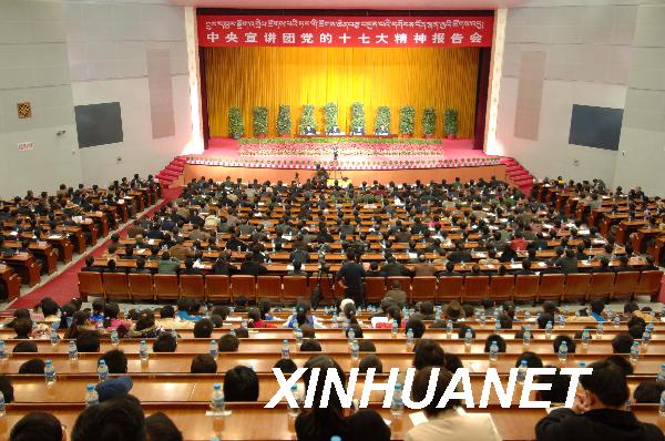11月11日,中央宣講團黨的十七大精神報告會在拉薩舉行,西藏各族各界1000多人與會,聆聽中央宣講團成員的報告。(新華社記者覺果攝)