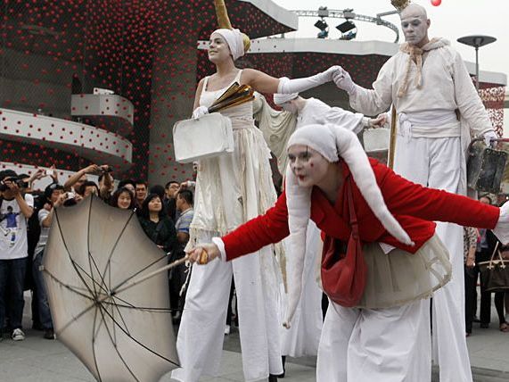 精彩紛呈的世博會,吸引了八方游客前來觀展。穿梭在展館之間的行為藝術表演,也是觀眾不容錯過的節目。更有觀眾自發上陣,支持世博,堪稱一絕。圖為在德國館前,行為藝術表演者吸引眾多觀眾駐足觀賞。(記者:劉歆?攝)