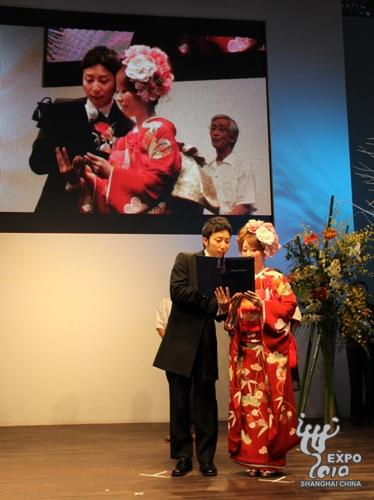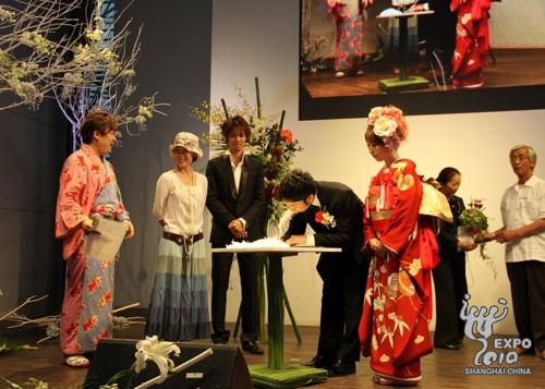 日本產(chǎn)業(yè)館JAL舞臺(tái)上,來自橫濱的新郎岡陽介身穿西式禮服首先登場(chǎng)。之后,同樣來自橫濱的新娘岡美緒身著正紅色、由3層衣服組成的日本傳統(tǒng)服飾――和服,腳踩木屐,在父親的引領(lǐng)下出現(xiàn)在觀眾面前。在兩位新人宣讀誓言、喝下交杯酒后,一位現(xiàn)場(chǎng)觀眾被邀請(qǐng)上臺(tái)作為證婚人之一,和新娘父母、主持人、歌手小松拓也一起在結(jié)婚證明書上簽字,見證兩人的結(jié)合。隨后,新人互換戒指,新郎向新娘送上深情一吻,至此,兩位新人正式結(jié)為夫婦,而現(xiàn)場(chǎng)觀眾也在此時(shí)送上了陣陣掌聲和祝福。