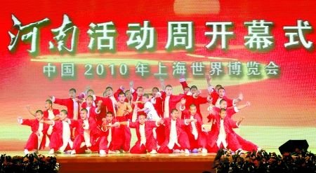 7月13日上午10時,在開封盤鼓、少林功夫威武雄壯的表演中,上海世博會河南活動周正式拉開帷幕。在接下來的5天時間里,來自河南的表演團(tuán)隊將在世博園寶鋼大舞臺上為國內(nèi)外游客奉獻(xiàn)一場場帶有中原地域文化特色、展示黃河兒女時代精神風(fēng)貌的大型戶外廣場演出。 (本版圖片除標(biāo)注外均為本報記者李建峰攝)