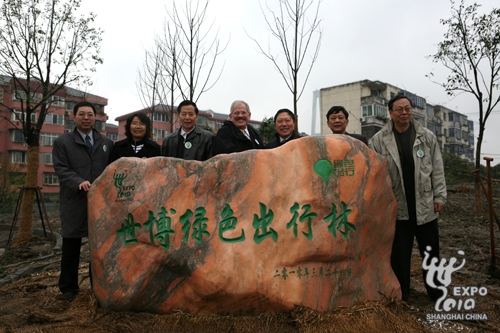 中國環(huán)境與發(fā)展國際合作委員會秘書長、原國家環(huán)保總局副局長祝光耀出席儀式,并親手種下第一株樹苗。來自上海市環(huán)保局、上海世博局、上海市綠委辦公室、上海市徐匯區(qū)政府、美國環(huán)保協會、中國民促會綠色出行基金以及77家行業(yè)協會和企業(yè)的代表參加了世博綠色出行林的揭牌儀式和植樹活動。