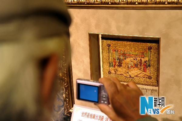 5月13日,在上海世博園伊朗館,一名參觀者在拍攝館內最精致的波斯掛毯。在上海世博園伊朗館的二樓,放了一摞摞的波斯地毯,色彩引人注目。其中規格為22×17cm、鑲在鏡框里用來展示的小塊波斯掛毯屬于最精致級別。據介紹,這塊掛毯100%蠶絲制成,工匠花費了20年的時間、使用放大鏡手工精織而成,每一公分的面積里織進了1200段。波斯地毯素以經久耐用而著稱,據說一塊普通的地毯用上十幾年也完整如新,加之其阻燃,于是又被稱為“鐵毯”。每一塊波斯地毯也都是一件工藝品,畫面豐富、色彩艷麗。許多人不舍得踩在腳下,就把整塊的地毯掛在墻上,做裝飾之用。新華社記者李紫恒攝