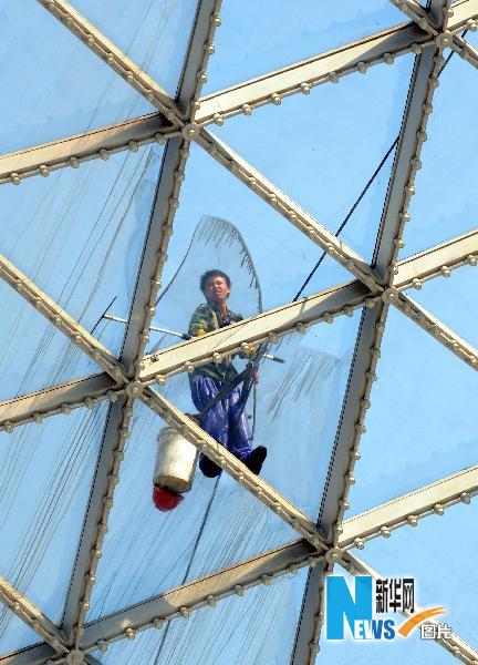 5月24日,一名工人在清洗世博園里的陽(yáng)光谷。位于世博軸上的6個(gè)巨型透明“喇叭花”——陽(yáng)光谷,每個(gè)高40米左右、開(kāi)口最大直徑96米,從地下6.5米延展到地上35米,能將陽(yáng)光、空氣引入世博園地下空間,運(yùn)用生態(tài)技術(shù)節(jié)約能源。新華社記者 楊世堯 攝