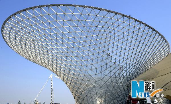 5月24日,幾名工人在清洗世博園里的陽(yáng)光谷。位于世博軸上的6個(gè)巨型透明“喇叭花”——陽(yáng)光谷,每個(gè)高40米左右、開(kāi)口最大直徑96米,從地下6.5米延展到地上35米,能將陽(yáng)光、空氣引入世博園地下空間,運(yùn)用生態(tài)技術(shù)節(jié)約能源。新華社記者 楊世堯 攝