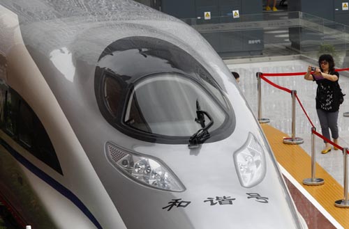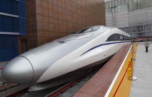 由中國南車集團股份有限公司制造的新一代高速動車組列車被放置在世博園中國鐵路館外。這種帶有CRH380A標(biāo)志的新一代高速動車組,最高運行時速可達380公里,是目前世界上商業(yè)運營速度最快、科技含量最高的高速列車。據(jù)介紹,京滬高鐵建成之后,該型號列車將在京滬兩地之間運行。