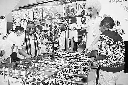 6月11日,觀眾在世博會南非館門口玩桌上足球游戲。本報記者 周凱攝