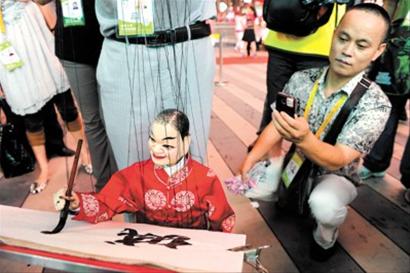 28日,來(lái)自福建省連城縣的木偶表演藝術(shù)家李明卿在世博會(huì)寶鋼大舞臺(tái)用手中的提線木偶揮毫寫(xiě)下了“城市,讓生活更美好”的世博會(huì)主題,讓在現(xiàn)場(chǎng)觀看的游客驚嘆不已。攝影:張馳