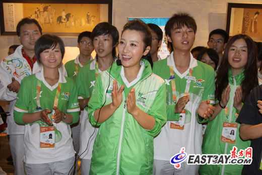圖片說(shuō)明:5月18日,著名青年歌唱家譚晶在中國(guó)元素畫(huà)坊與志愿者共同演唱世博志愿者歌曲《世界》。