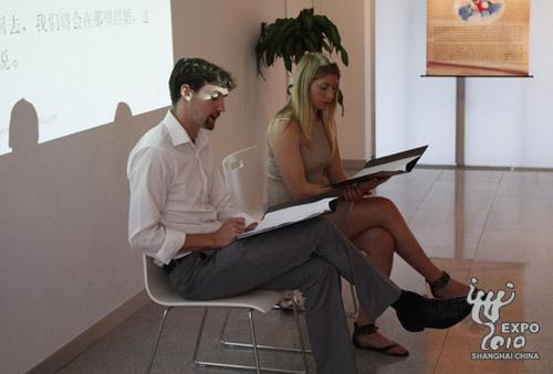 30日下午,在上海世博會愛爾蘭國家館內,數十名游客興致勃勃地聆聽兩名愛爾蘭工作人員講述一個古老的愛爾蘭傳說,尤其引人注意的是,其中一個金發碧眼的愛爾蘭小伙竟是在用中文講故事。