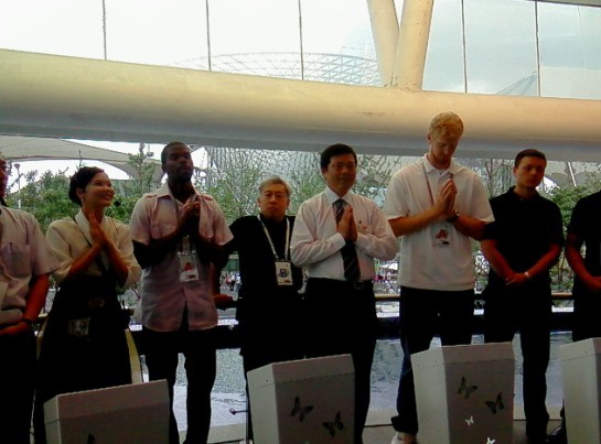 據世博會臺灣館消息:“世界和平、愛與和平”、“家人健康”,7月26日下午,兩名NBA火箭隊球星巴丁格、布魯克斯在世博園臺灣館和8名中國小朋友一起,參加點燈祈福儀式,他們用放飛孔明燈的儀式共同許愿祈福。