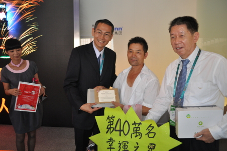 在現(xiàn)場的歡呼聲中,工作人員獻上“第40萬名幸運之星”的牌子,臺北館館長陳慶安也特別致贈臺北名產(chǎn)鳳梨酥、數(shù)碼相框、臺北國際花卉博覽會的邀請卡及花博一日劵二張等禮物給幸運的林金火先生。陳館長也不忘提醒大家,重要的是在上海世博會之后,臺北花博即將于11月6日展開,他邀請大家“相約臺北花博見!”,也歡迎大家到臺北觀光。同時陳館長也宣布同梯次參觀的游客通通有獎,每位都可以在互動體驗區(qū)拍攝臺北景點合成照,引起全場鼓掌。而臺北館陳館長也透露臺北館第50萬名幸運臺北館將會送出更多大獎。