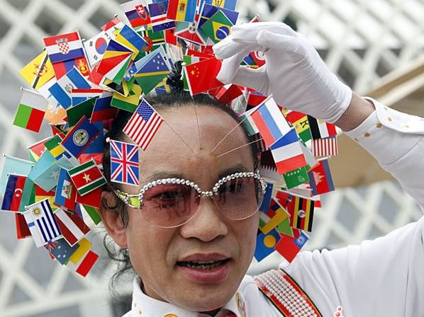 精彩紛呈的世博會(huì),吸引了八方游客前來觀展。穿梭在展館之間的行為藝術(shù)表演,也是觀眾不容錯(cuò)過的節(jié)目。更有觀眾自發(fā)上陣,支持世博,堪稱一絕。圖為有廣西人奇人之稱的韋盛初,頭上插滿世博旗幟的銀針,支持世博。(記者 劉歆/攝)