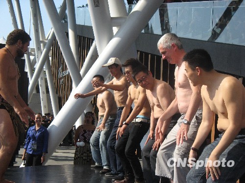 5月24日,上海世博會新西蘭館門前十分熱鬧,十多名新西蘭演員在世博會場舞臺上,表演他們頗具特色的民俗舞蹈,吸引了眾多游客的目光,觀眾們紛紛參與互動,現場氣氛十分熱烈。