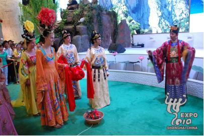據(jù)悉,此次活動是陜西館開館以來舉辦的最大規(guī)模的一次文化活動,以陜西館形象大使“唐明皇”、“楊貴妃”與陜西華清池《長恨歌》藝術(shù)團(tuán)的表演及各種互動游戲為主要形式,開展大唐婚典、愛的郵遞、明皇賜印、七夕盟誓、投壺比賽等體驗活動,為游客留下歡快、愉悅的美好記憶。(世博網(wǎng))