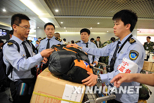 6月3日晚,來自遼寧省衛(wèi)生防疫系統(tǒng)的救災隊員在成都雙流機場領取行李。