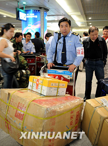 6月3日晚,來自遼寧省衛(wèi)生防疫系統(tǒng)的救災隊員在成都雙流機場領取行李。新華社記者張領攝