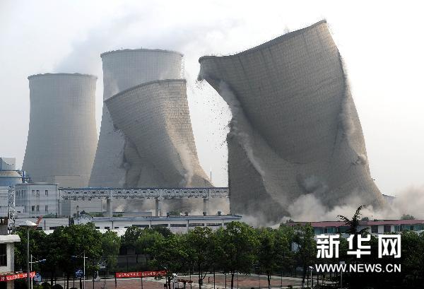 9月16日,浙江電廠爆破90米巨型冷卻塔。華能長興電廠在8月份關停了兩臺125兆瓦級的發電機組,這兩臺發電機組已經工作18年。舊機組關停后,每年可節約標準煤50多萬噸,減少二氧化硫排放1000多噸,減少粉塵排放300噸左右。 新華社記者徐昱攝