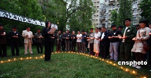 五月二十一日晚,旅居莫斯科的華人華僑、留學(xué)生自發(fā)匯聚在伊茲麥伊洛沃公園附近,悼念四川大地震遇難者。 中新社發(fā) 田冰 攝