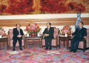 圖1:中共中央政治局委員、國(guó)務(wù)院副總理錢其琛(中)親切會(huì)見(jiàn)訪問(wèn)團(tuán)。