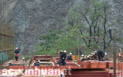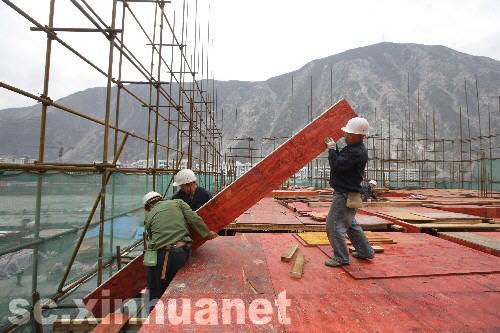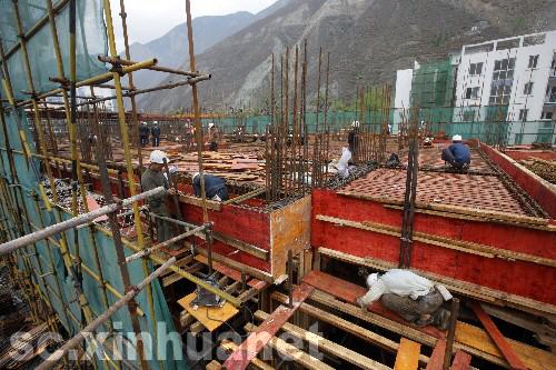 4月18日,工人在汶川縣人民醫(yī)院施工現(xiàn)場工作。 新華社記者邢廣利攝