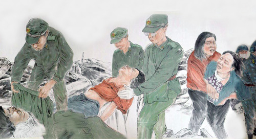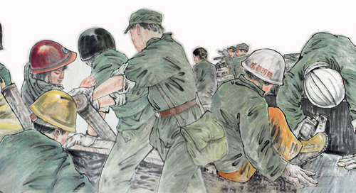 這幅被命名為《振起豐碑》的國畫人物長卷,高1米多,長100多米,裱好后的重量達30多公斤,畫卷中的人物多達600多名,有領導人親臨一線指揮救災的情景,有解放軍官兵奮力救災的情景,有醫務人員冒險救死扶傷的場面,還有從廢墟中被救出的人們,感嘆劫后余生的場景。