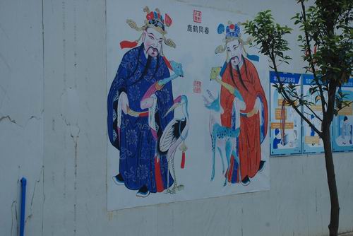 綿竹是我國的年畫之鄉(xiāng),綿竹年畫與天津楊柳青、江蘇桃花塢、山東濰坊并稱四大年畫。貼年畫、畫年畫是綿竹人民風俗。景觀大道2號立交橋板房安置區(qū),有板房約2萬間,這里安置的都是綿竹市區(qū)房屋受損的居民,最多時達5萬人,是汶川地震后最大的一個板房區(qū)。在這里,不僅能看到整齊的街道,旺長的花草,還有街道兩旁墻壁上貼著的鮮活年畫,年畫或講民間故事、或是歷史傳說,人物栩栩如生、身姿形態(tài)各異,個個飽含笑意,讓人遠遠地就感受到一股暖春的氣息……