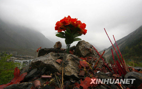 4月2日,在北川縣老縣城的山頭上,吊唁者放上一束紅色的塑料花,祭奠逝去的親人。新華社發(鐘敏 攝)