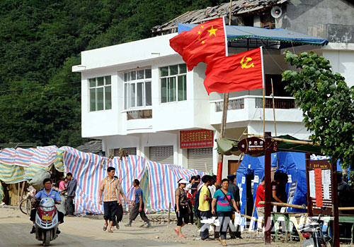 6月2日,在四川青川縣關(guān)莊鎮(zhèn)的抗震指揮部帳篷前,黨旗和國旗迎風(fēng)飄揚。新華社記者 楊金志 攝 |