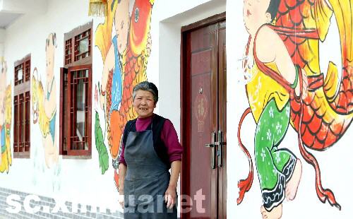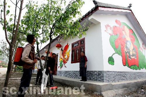 四川省綿竹市棚花村在汶川大地震中受災嚴重。經過近一年的重建,這個小村莊已重新煥發生機,別具特色的年畫在新建的民房外墻上隨處可見。棚花村多年來形成了在墻上繪制綿竹年畫的習俗,地震前是遠近聞名的旅游觀光村。