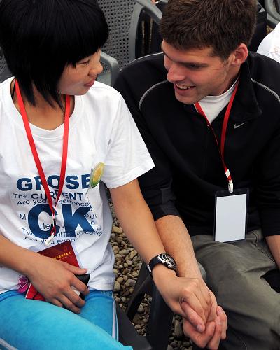5月11日,在四川安縣“真情大愛·回到災(zāi)區(qū)再看看”致謝活動現(xiàn)場,美國志愿者但以理和戀人、中國志愿者董明珠交談。兩人在去年地震災(zāi)區(qū)志愿服務(wù)活動中相識相愛。時值汶川大地震一周年之際,但以理特意從美國飛回四川安縣,與在災(zāi)區(qū)堅持服務(wù)了近一年的董明珠相聚,并在災(zāi)區(qū)學(xué)校教孩子們學(xué)英語。新華社記者王茜攝