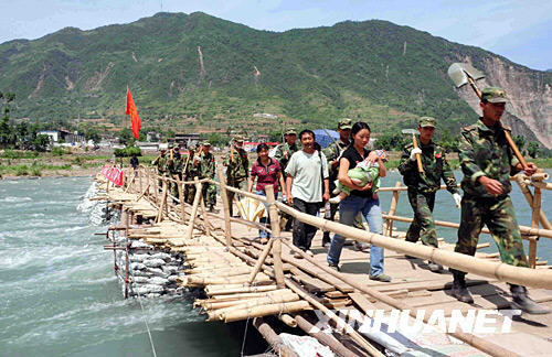 汶川大地震后,由于山體塌方、橋梁受損,四川平武縣南壩鎮(zhèn)成為一座“孤島”。前來救援的空軍某部官兵在缺乏建材和工具的涪江邊,用鐵絲、石袋、竹木等材料架起一座便橋,方便盡快救出傷員、運送救災(zāi)物資。 新華社發(fā)(沈玲 攝)