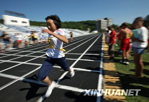 8月3日,在俄羅斯南部黑海之濱圖阿普謝的“小鷹”全俄兒童中心,正在這里療養(yǎng)的四川地震災(zāi)區(qū)學(xué)生(左二)與俄羅斯學(xué)生一起參加百米跑比賽。當(dāng)日,“小鷹”全俄兒童中心舉行運(yùn)動(dòng)會(huì),中俄學(xué)生同場(chǎng)競(jìng)技,一展風(fēng)采。新華社記者沈伯韓攝