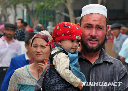 7月12日,在新疆阿克蘇市規模最大的托克遜巴扎上,一名男子抱著孩子趕巴扎。