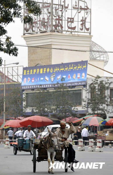 7月12日,一位老人駕著驢車前往新疆和田市艾提卡大巴扎趕巴扎。新華社記者 趙戈攝