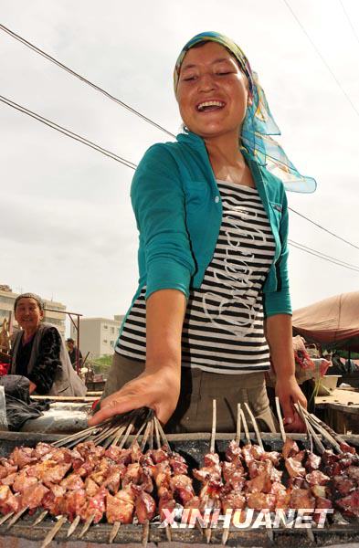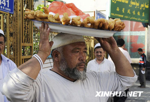 7月12日,在烏魯木齊山西巷巴扎上,一名商販在叫賣特色小吃。當日是新疆不少地方的巴扎日,各族群眾紛紛走出家門,扶老攜幼趕巴扎,選購生產生活用品。巴扎在維吾爾語中意為集市,遍布新疆城鄉。因為地處古老的絲綢之路上,新疆人自古就有經商的傳統,巴扎就是他們從事商貿活動的場所。新華社記者 陳樹根 攝