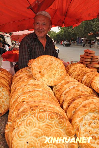 7月12日,在新疆伊寧市漢人街巴扎上,一名老者正在賣馕。新華社記者 才揚攝