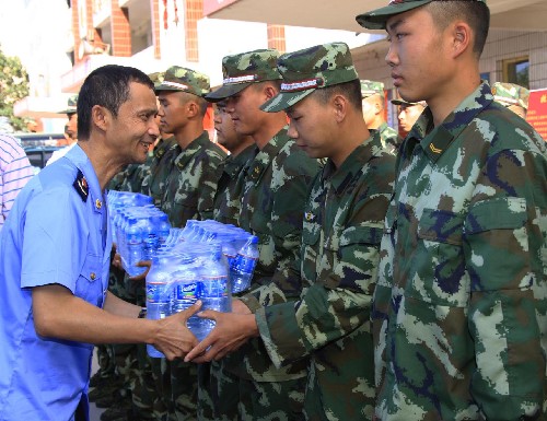 7月14日,新疆喀什疏勒縣工商行政管理局干部(左一)向執(zhí)勤的武警官兵送上飲用水。當(dāng)日,新疆喀什疏勒縣工商行政管理局員工和疏勒縣私營(yíng)個(gè)體協(xié)會(huì)會(huì)員慰問執(zhí)勤的武警官兵,為他們送去飲用水、西瓜等慰問品。 新華社記者 李明放 攝