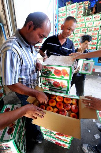 7月20日,工人在霍爾果斯競(jìng)天國(guó)際客服中心為來自哈薩克斯坦的卡車裝車。進(jìn)入夏季,新疆霍爾果斯口岸果蔬出口繼續(xù)保持較好的增長(zhǎng)勢(shì)頭,每天往來口岸采購(gòu)、運(yùn)送果蔬的客商和物流車輛絡(luò)繹不絕。廣西的菠蘿、海南島的香蕉、山東的辣椒、陜西的蘋果以及新疆伊犁河谷出產(chǎn)的時(shí)鮮蔬菜經(jīng)霍爾果斯口岸源源不斷地進(jìn)入中西亞各國(guó)。據(jù)了解,2008年以來通過該口岸銷售到中亞國(guó)家的蔬菜、果品接近20萬噸,其中90%以上來自內(nèi)地;魻柟箍诎兑殉蔀槲覈(guó)西部重要的果蔬出口重要通道。 新華社記者 李紫恒 攝