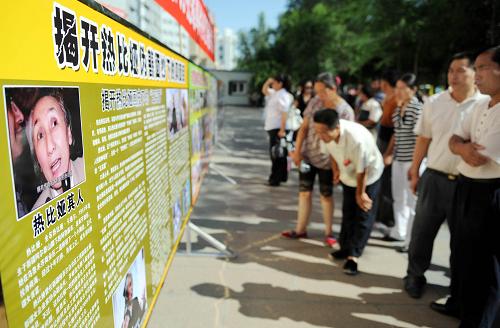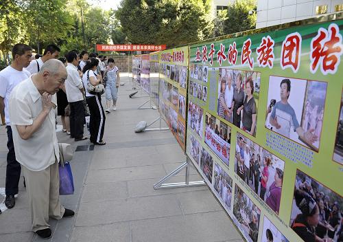 7月21日,市民在烏魯木齊市圖書館前觀看圖片展。當(dāng)日,由烏魯木齊市委宣傳部、文化局主辦的新疆維吾爾自治區(qū)烏魯木齊市打砸搶燒嚴(yán)重暴力犯罪事件紀(jì)實圖片展在烏魯木齊市圖書館前展出,300余幅圖片真實地再現(xiàn)了烏魯木齊“7·5”事件發(fā)生、處置、善后全過程。從22日起,該圖片展還將進入部隊、社區(qū)、學(xué)校、鄉(xiāng)鎮(zhèn)等地巡展。新華社記者王菲 攝