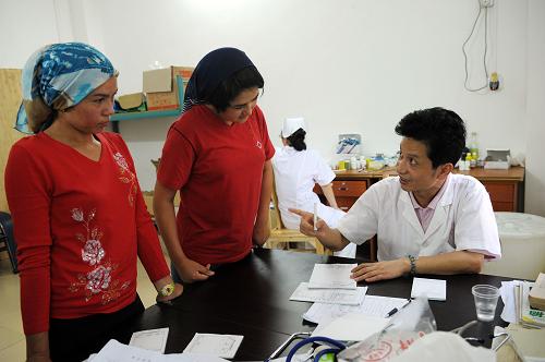 7月22日,韶關(guān)市曲江區(qū)中醫(yī)院醫(yī)生杜鳴(右)在韶關(guān)旭日玩具廠醫(yī)務(wù)室為新疆籍員工看病。新華社記者 劉大偉 攝