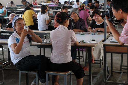 7月22日,在韶關(guān)旭日玩具廠務(wù)工的一名新疆籍員工(前左)拿起手機(jī)與正在采訪的記者對(duì)拍起來(lái)。目前在韶關(guān)旭日玩具廠工作的新疆籍員工有755人,7月以來(lái),員工總數(shù)一直保持穩(wěn)定。韶關(guān)市委副書(shū)記林耀明表示:“我們不會(huì)讓一次偶然發(fā)生的治安事件影響到韶關(guān)和新疆的經(jīng)貿(mào)合作和務(wù)工交流。未來(lái)我們將進(jìn)一步采取措施,妥善安置新疆籍員工在韶關(guān)的務(wù)工、生活,讓他們?cè)谏仃P(guān)長(zhǎng)期安心就業(yè)。”新疆勞務(wù)輸出先進(jìn)縣——喀什地區(qū)疏附縣負(fù)責(zé)人也表示:“經(jīng)過(guò)廣東和新疆兩方面的共同努力,在韶關(guān)安心地長(zhǎng)期就業(yè),已是這里700多名新疆少數(shù)民族外出務(wù)工人員的共同心聲”。由于近日廣東天氣炎熱、氣候潮濕,有個(gè)別新疆籍員工感到不適應(yīng)而離開(kāi)韶關(guān)返回家鄉(xiāng)。旭日玩具廠負(fù)責(zé)人說(shuō),盡管采取了一系列防暑降溫措施,但由于兩地氣候環(huán)境差異大,還是有一些新疆籍員工感冒、中暑。“他們回新疆避暑,我們是理解的。歡迎他們?cè)谑钇谶^(guò)后繼續(xù)回來(lái)工作。”這位負(fù)責(zé)人說(shuō)。 新華社記者 劉大偉 攝