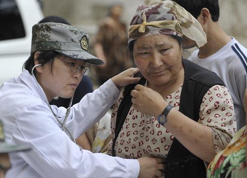 7月23日,解放軍第二十三醫院醫務人員為烏魯木齊八戶梁社區一位居民量血壓。當日,解放軍第二十三醫院醫務人員來到烏魯木齊八戶梁社區開展義診活動,社區內上百位各族居民前來問診,軍醫們還為當地贈送了一些常用藥品。新華社記者 趙戈 攝