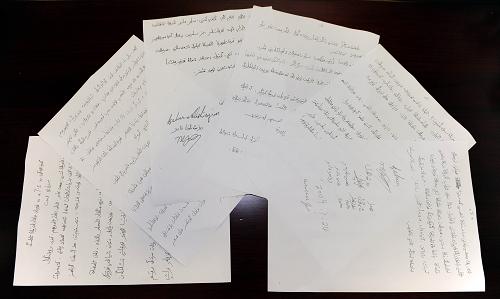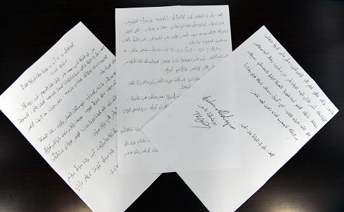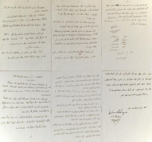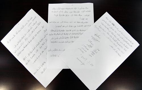 這是熱比婭境內(nèi)親屬分別致熱比婭和烏魯木齊“7·5”事件遇難者家屬的信件(8月2日攝)。熱比婭在境內(nèi)的親屬--兒子卡哈爾、女兒茹仙古麗和弟弟買買提等,近日分別致信熱比婭和烏魯木齊“7·5”事件遇害者家屬,對熱比婭違背了自己的誓言參與分裂活動表示不滿,對暴力事件表示氣憤,對無辜死亡的群眾和他們的家屬表示歉意。新華社記者 丁林 攝
