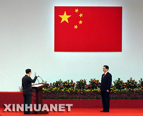 7月1日,慶祝香港回歸祖國十周年大會暨香港特別行政區第三屆政府就職典禮在香港會展中心舉行。這是香港特區第三任行政長官曾蔭權面對胡錦濤主席,舉起右手莊嚴宣誓。 新華社記者公磊攝