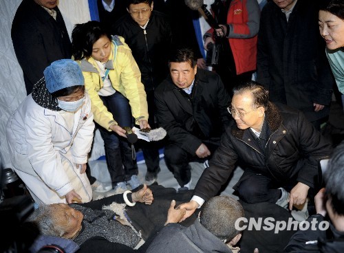 4月15日20時,中國國務院總理溫家寶來到青海省玉樹縣玉樹自治州醫院看望受災民眾。這是溫家寶握著一位藏族大媽的手問候其身體情況。 中新社發 廖攀 攝