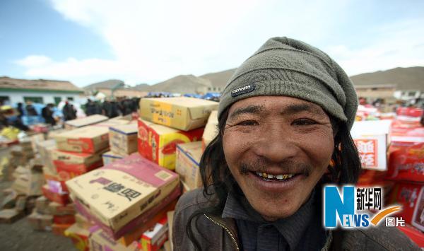 4月22日,隆寶鎮窘青二村牧民白文領到救援物資后露出笑容。新華社記者費茂華攝