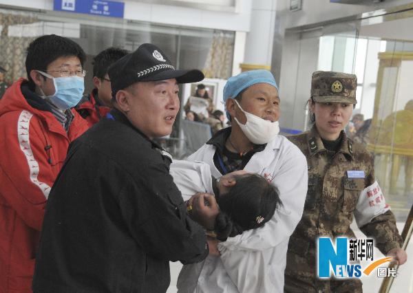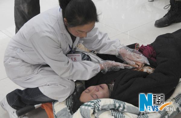 當日,連續10天高強度工作在地震災區傷病員救治一線的女醫生吳敏,由于體力透支,在玉樹機場轉運傷員時暈倒在停機坪上。吳敏經過緊急搶救后體力稍稍恢復,她仍掛念著傷病員的救治工作,很快又登上救護車,往救治點奔去。今年31歲的吳敏是青海果洛藏族自治州達日縣人民醫院的醫生。玉樹地震發生后,她隨縣醫療救援隊連夜趕到600多公里外的玉樹災區救治傷員。從4月14日起,吳敏和隊友連續奮戰,已先后救治了近300名傷病員。新華社發(武國強 攝)