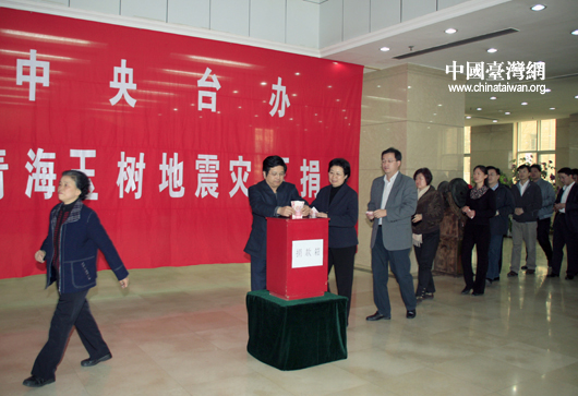 中國臺灣網4月20日北京消息 中共中央臺辦、國務院臺辦及海峽兩岸關系協會20日下午組織全系統員工進行捐款,為青海玉樹地震中的受災同胞獻上愛心。