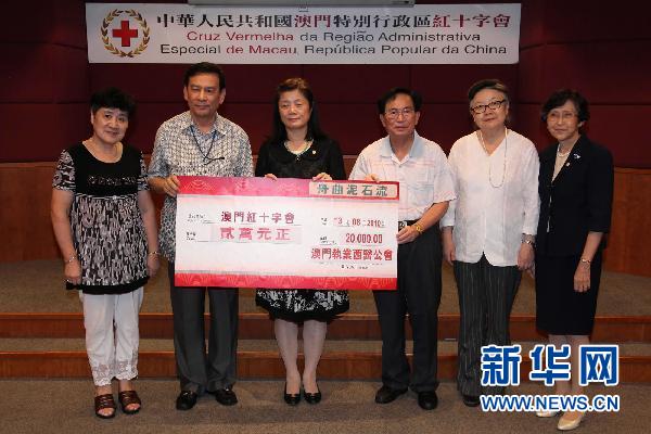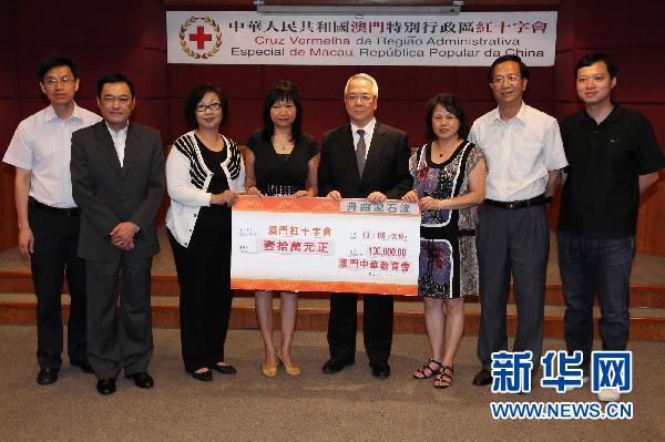8月13日,澳門中華教育會向澳門紅十字會捐贈10萬澳門元,援助甘肅舟曲受災群眾。截至當日,澳門紅十字會共收到澳門社會各界向舟曲災區(qū)的捐款373.06萬澳門元。 新華社發(fā) (張金加攝)